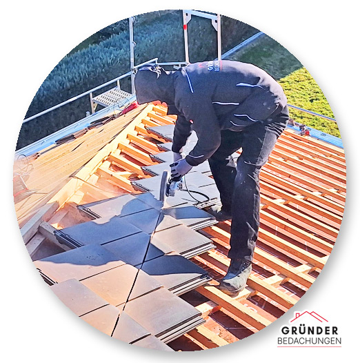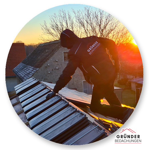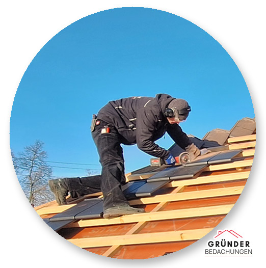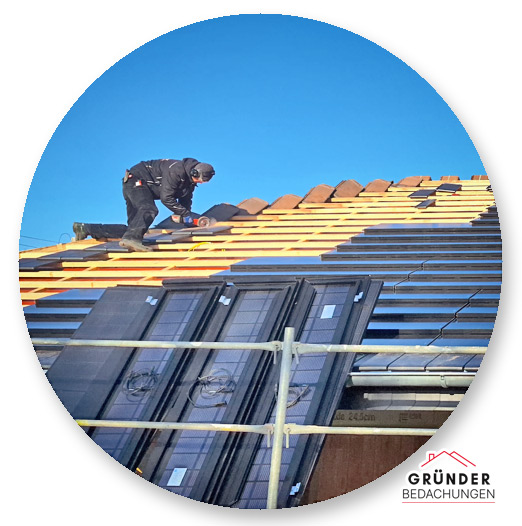 Dieses Bild zeigt uns bei der Monatge einer dachintegrierte Photovoltaikanlage, die sich harmonisch in die Dachfläche einfügt und gleichzeitig umweltfreundlichen Strom erzeugt.